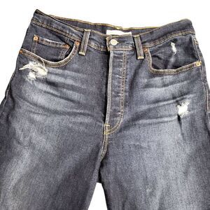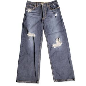 Levi's Ribcage Straight Ankle Jeans size 30, ripped button fly denim, distressed Levi's high rise jeans, women’s straight leg ankle jeans, trendy ripped Levi’s, torn denim jeans, intentionally distressed Levi's, back to school jeans, classic blue jeans Levi's