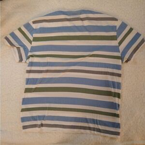 V-neck t-shirt with blue, white and gray stripes. 100% cotton.