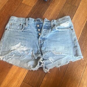 Light wash button fly cut offs distressed. Already broken-in and made better by time.