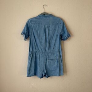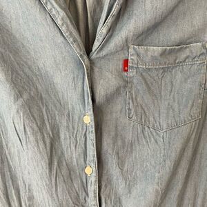Size medium. Has the front button and tie at the waist. No flaws. Light wash soft denim chambray.