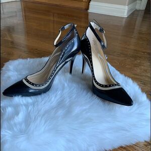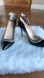 Classic black heels upper leather mesh side panel gold tone accent beads (wear marks and peel inside please see all pictures) otherwise in great preloved condition smoke/pet free