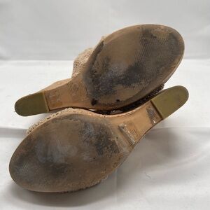 Levity bohemian crochet wedge platform saddle with open toe, sides, and back. Back buckle closure. I found them to be very comfortable.