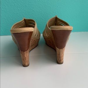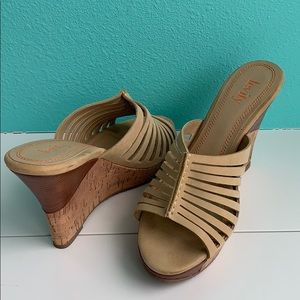 This lovely pair has a layer of tan straps, 4 1/2” platform wedge heels made of cork and stacked wood, embossed rubber soles. Comfortable to wear. EUC