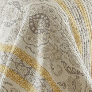 The St. Claire Reversible Quilt Set by Levtex Home is inspired by traditional suzani patterns. This modern, traditional suzani design will immediately transform your bedroom. Made with the softest lightweight cotton and filled with a cotton-rich filler (that includes cotton, polyester and other fibers), this reversible quilt features a grey suzani and yellow paisley pattern, reversing to yellow paisley icons on the other. The Quilt Set is machine washable. Enjoy this for years to come!