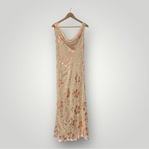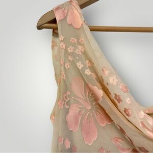 Absolutely stunning sheer beige mesh maxi dress with luxurious rose gold satin floral appliqué. Features a flattering draped cowl neckline and flowy silhouette that hugs in all the right places. Perfect for weddings, garden parties, date nights, or a beach vacation.