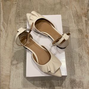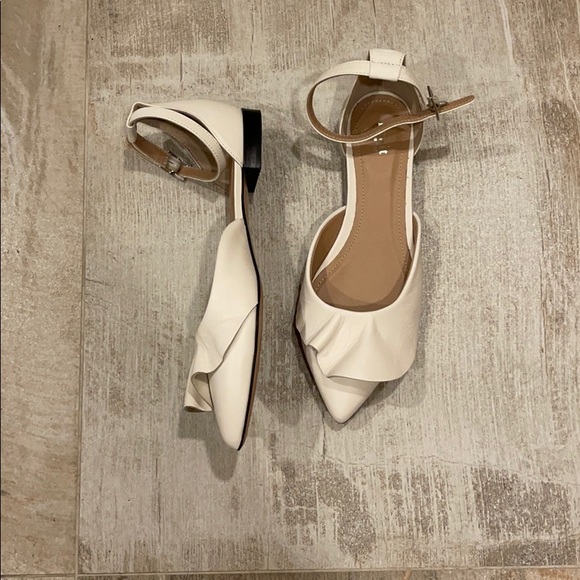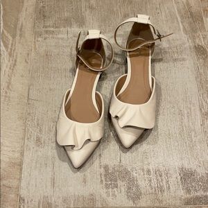 A feminine ruffle frills the topline of a pointy-toe flat that looks especially chic when paired with ankle-length bottoms.