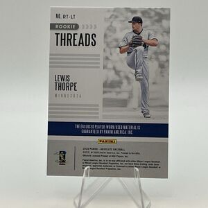 2020 Absolute Threads Rookie Jersey trading card featuring baseball player Lewis Thorpe from the Minnesota Twins. This collectible item is part of the Major League Baseball series and is designated with card number RT-LT.