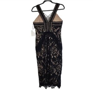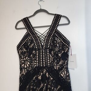 Lewit Black Cream Nude lace cocktail Evening Dress. Figure hugging, lace detail, back zipper.