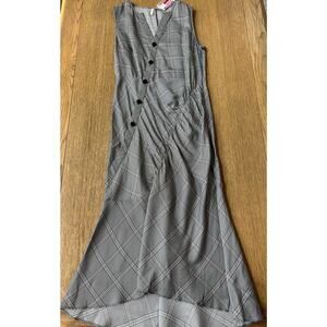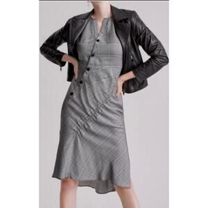 This Lewit dress is made from a lightweight crepe in a black York check and features a split neckline, a diagonal buttoned front, an asymmetrical midi skirt with ruched detail, and a slide slit and an invisible side zipper closure. Retail was $445.