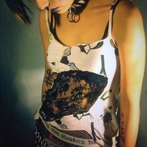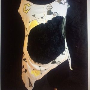 One of a kind designed and hand sewn "boy" print tank top with black lace inlay by Lexa Vonn. This long asymmetrical custom tank is made of stretch cotton with yellow outside stitching and a black lace peek-a-boo panel over the stomach. Made in the USA of 💯 recycled materials. Comes with one of a kind signed art card for authenticity.