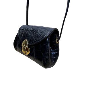 Croc-embossed leather bag with adjustable strap and gold-tone hardware. Features a compact design with a secure twist-lock closure and "Made in Italy" craftsmanship.