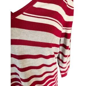 Soft and stretchy red-and-white striped sweater with a relaxed fit and flattering V-neck. Lightweight rayon-blend knit, great for layering or wearing on its own. Hits around hip length with 3/4 sleeves. In excellent condition — no flaws noted.