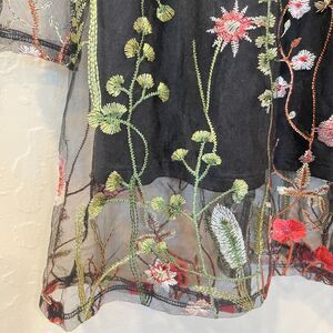 ~ Lg Floral Boho Sheer Dress Botanical Black Flowers Long Sleeve Bohemian Knee