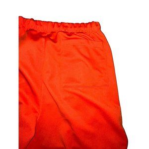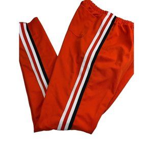 The Orange pants have an elastic waist with a drawstring and will fit a 26 to 34 " waist. The tag states them to be a size Medium. They have one pocket in the back and the matching colored banding running down the length of both legs. The inseam is 36" and have not been hemmed.