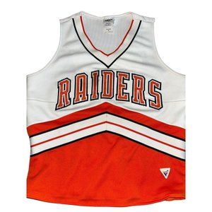 The top pulls over the head and has a power stretch back which gives a form fitted look. RAIDERS lettering runs across the front. The VARSITY logo is located at the lower left side. It will comfortably fit a 36 to 40” chest. Tag states it to be a size 38+1.