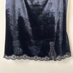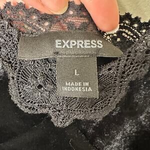 Slip into elevated elegance with this Express velvet cami top in a rich black hue, size Large. Crafted with plush velvet fabric, the top features delicate black lace trim along the bust line and straps—plus a subtle front-side slit for added movement and sophistication.