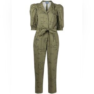 Casitas abstract-print jumpsuit from LHD featuring forest green, cotton blend, illustration-style print, V-neck, short puff sleeves, button fastening, tied waist and ankle-length.