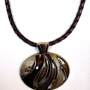 Pendant Necklace: The circular pendant has a bold yet graceful design, suspended on a braided brown leather cord, which adds a rustic charm. The clasp ensures a secure and comfortable fit.
