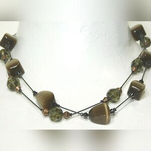 This gorgeous Lia Sophia "JAVA" necklace is a true standout piece, combining elegance and earthy tones. It features smooth, glassy cat's eye stones in a warm brown hue that shimmer beautifully under light, paired with olive-green faceted beads that add depth and dimension. Delicate metallic accents and smaller copper-tone beads enhance its layered, modern look, while its double-strand design adds a touch of sophistication. Measuring 16 to 19 inches with an adjustable chain, this necklace ensures a perfect fit for various necklines. Brand new with tags, it’s a timeless accessory perfect for any wardrobe.