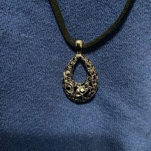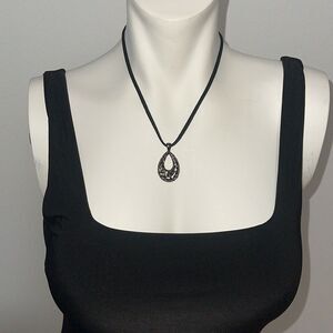 Lia Sophia Mon Cheri tear-drop shaped pendant with black cut crystals in a blackish gunmetal setting, on a leather cord, 16-19"