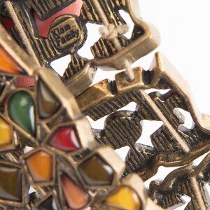Lia Sophia "Mosaic" Stretch Bracelet – Kiam Family Collection Multicolor Bronze. A bold statement bracelet. Featuring resin stones in rich shades of yellow, brown, burgundy, and green, set in a bronze-tone stretch band. The mosaic of colors and shapes makes this piece versatile enough to complement a variety of outfits.