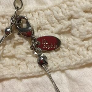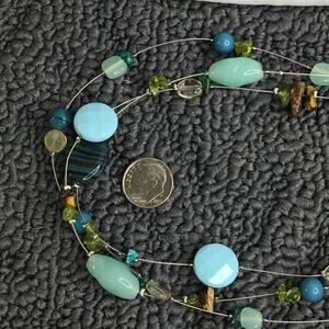 Lia Sophia Multi-Strand Floating Necklace Blues. Beads are acrylic, gemstone, and possibly glass on three strands. Crimp beads, extender, and lobster claw clasp are silver tone. Beads are strung on what appears to be a plastic covered wire with a silver tint. Dime shown for size reference only and is not included in the listing.