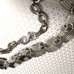 This beautiful Infinitme necklace by Lia Sophia has large teal crystals and silver tone metalwork. This is part of the Infinitme interchangeable necklace collection, which comes without a clasp. However, I have added a Lia Sophia double lobster claw clasp for your convenience. It is 19" long and the crystals are 16mm. The necklace is in perfect condition.