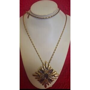 Smoky quartz colour crystals sit very well in this diamond shape gold tone pendant. Necklace also stamped Lia Sophia; measuring 36" long. Pendant measuring 2.75" in diameter.