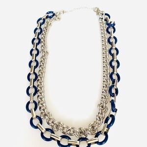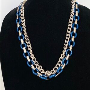 A double stranded statement necklace is in like new condition. It is a heavy chunky necklace with shine silver tone and dark blue links. This is a new without tags item. Please, see pictures for more details.