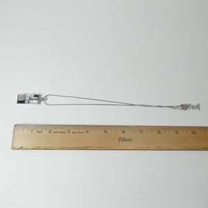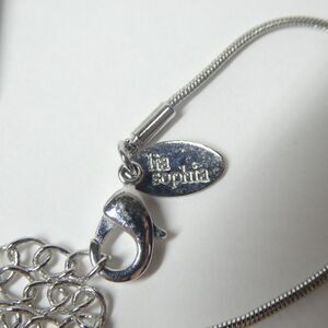 Lia Sophia necklace. Silvertone metal chain, about 16 length, with rectangular pendant. Pendant features a patchwork of mother of pearl and black enamel rectangles. Great shape with minor wear from handling.