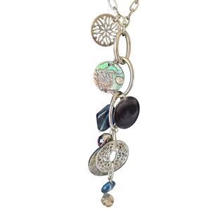 This stunning necklace from lia sophia features a unique asymmetrical pendant shape with a tassel design. The necklace is made with genuine abalone and glass beads in a beautiful multicolor pattern, perfect for any occasion such as Mother's Day, Christmas, Anniversary, Birthday, or just as a fashion statement. The necklace has an 18 inch lobster closure and is signed for authenticity. The silver tone metal is complemented by the mother of pearl/abalone secondary stone, adding a touch of beach and sea life to the bohemian and fashionable design. This adjustable necklace is a must-have for anyone looking to add some beauty and style to their jewelry collection.