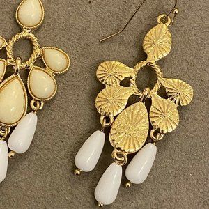 These beautiful earrings by Lia Sophia are in her "Rhumba" line. They have beige cabochons on top and white dangles at the bottom, all with textured gold tone settings. They are 2.75" long, on the original card and in perfect condition. They are nice and light weight for comfort while wearing.