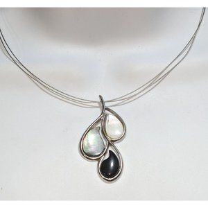 Glamorous and unique shell teardrop necklace by Lia Sophia. It's on a double length of silver tone beading wire, and has a lobster clasp closure with a Lia Sophia hang tag. It has a silver tone pendant made of three teardrop shapes that are housed together in an open silver tone bezel that sort of resembles a leaf. One of the teardrops is black, one is made from white shell, and one is made from grey shell with a rainbow pearlescent tone. The pendant is also marked Lia Sophia on the back.