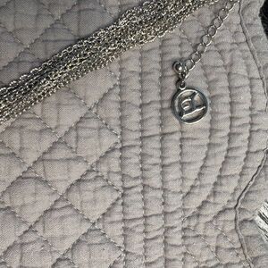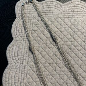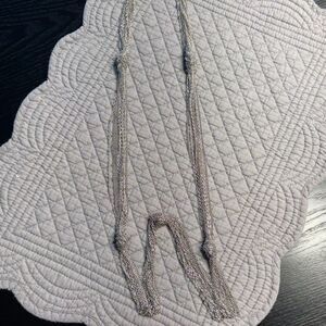 Lia Sophia Silver-tone mesh chain necklace featuring a multi-strand design with decorative knotted accents. Approx. 44-inch length. No metal markings. Lobster clasp with extender. Excellent preowned condition.