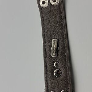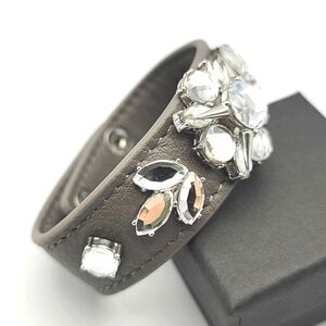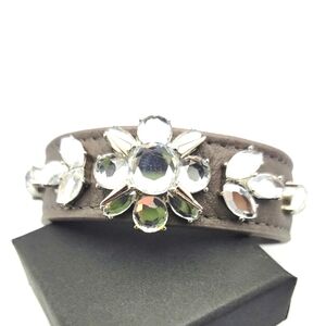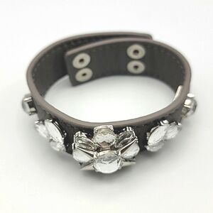 This elegant women's Lia Sophia bracelet features a stunning silver rhinstone design on a chic gray leather style band. Perfect for adding a touch of sophistication to any outfit. Bracelet is adjustable as shown in photos with size 7.5" being the largest. Button snaps allow for two sizes and 6" being the smallest.