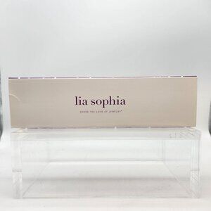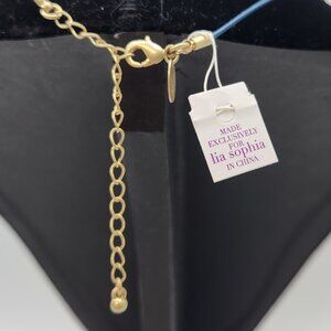 lia sophia style no. 34314 necklace. Small round gold-tone pendant with clear crystals on adjustable blue double cord. Pendant is 5/8" diameter. Cord is 14" with a 3" extender chain. New with tags in box. Box has a couple minor dents and tag is slightly yellowed.