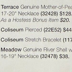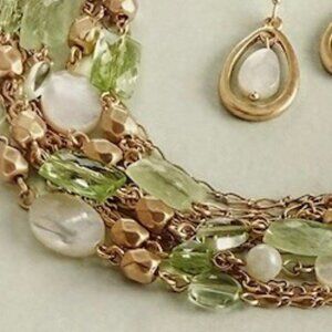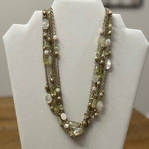 ~Multi-strand, gold-tone statement necklace is a mix of beads, including pale green and white resin beads, gold tone beads and genuine mother-of-pearl.