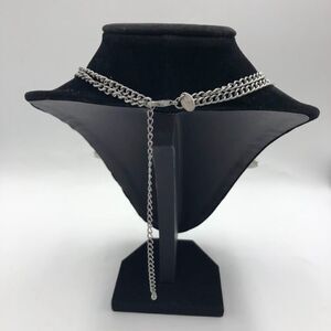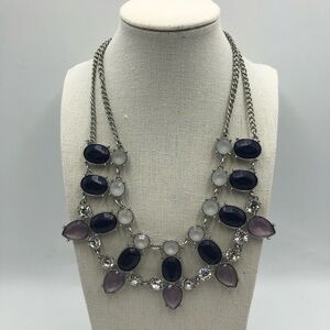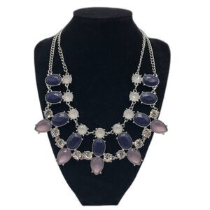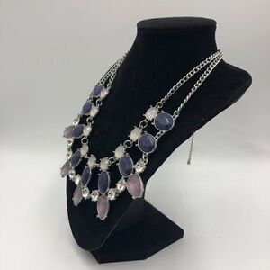 Lia Sophia Women's Chunky Link Statement Necklace Purple Rhinestone Silvertone Runway Fashion. Necklace is pre-owned. Please see all photos for visible condition. No original box. Approximately 14 - 16 inches. Kind of a choker style. Has a mix of colors including light purple and what looks like a dark navy or even purple if in a particular light and a pearl color. Plus rhinestones. No missing stones. May need some light cleaning - looks like possible minor discoloration on logo chain and clasp but just may be age/metal type related - is not bad/very minor -see photos.