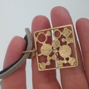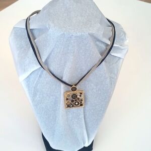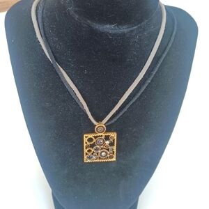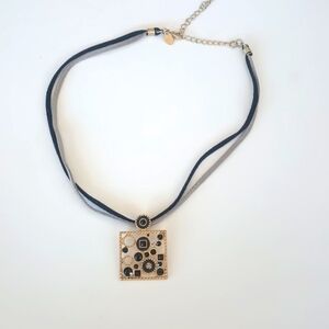 Lia Sophia adjustable length choker pendant necklace. Suede black and gray leather chain. Faux stone onyx and zirconia. Please note that this item is in good used condition so there may be some minor imperfections. Please see the photos.
