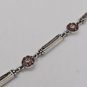 Silver tone bracelet with foldover clasp. Has bar shaped links with raised white lines and wire/cable lines. Between these are round links with pinkish rhinestone flowers. In good used condition. Approximately 7.5"