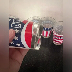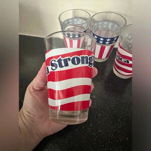 Libbey America Strong Glasses set of 4. Two are America strong. Two just have the flag on it. Bottom of one of the glasses is chipped. See picture
