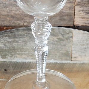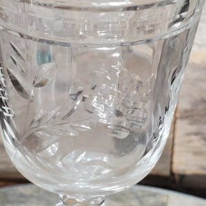 This Crystal Glass by Libbey Glass Company has intricate floral design and bands around the bowl. The stem is very unique and brings the Art Deco style of the 20's to mind.