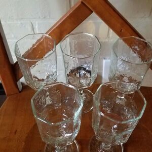 Octagonal Faceted Cup on top of a Beautiful pebble textured stem from libbey. Clear glass. Set of 5 Vintage Clear Glass