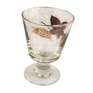 This elegant vintage cordial glass features a sophisticated gold leaf design, adding a touch of class to any collection or table setting. Its footed base provides stability and a touch of nostalgia, making it suitable for both display and use.