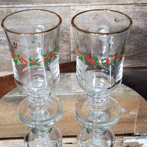Libbey Irish Coffee Mug - Green & Red Holly - Red Ribbon -They are clear glass with a mid-bowl green holly, red berry, and red ribbon garland, and have a gold rim.