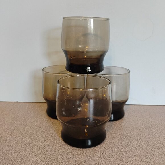 Vintage MCM 1960s Libbey Rocks Glasses. Tawny Brown in color, stackable , measures 3.25" in height, holds 10 ounces. Set of 4, all in excellent condition