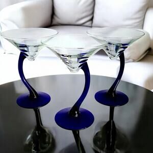 Libbey Swerve Cobalt Blue Stem Martini Glass Set Of 3- Vintage