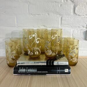 Stunning set of 9 Libbey vintage amber drinking glasses from the 1960's Featuring a beautiful floral design, these mid-century highball glasses are perfect for entertaining or for adding a unique piece of decor to your vintage-themed kitchen or bar.
