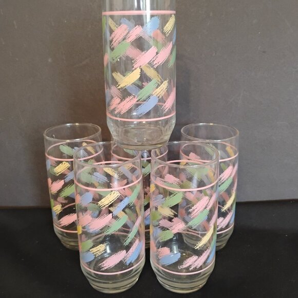 Vintage 1980s Libbey Tumblers, set of 6. Pastel Brush Stroke pattern, measures 6" in height, holds 14 ounces. In excellent vintage condition
