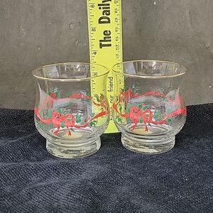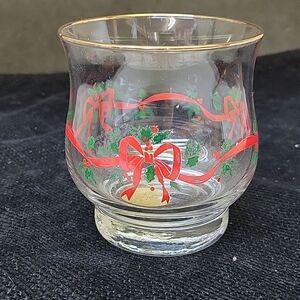 Set of Vintage Libbey 1984 Christmas Arby's tulip shapeWITH THE HOLLY, BERRY AND RIBBON DESIGN DISTRIBUTED BY ARBY'S Double Old Fashioned vintage1985 holly berry with bow glasses -tulip shaped 6 oz,,- 3.5" H. X 3". We have 2 matching 8" plates to go with the set.